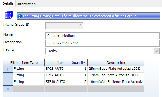 You can create a group of fittings. This is a time-saving device. It means that you can apply a single fitting group to an estimate rather than many individual fittings. For example, you may have a group called Column Fittings that contains 1xBP30 fitting and 1xCAP15 fitting. A fitting group can also contain other fitting groups.