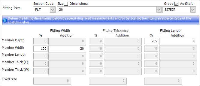 In the example below, the fitting item is a 20mm thick plate. As this is a non-linear section (and the Size: Dimensional check box is not selected), dimensions are needed for the width and length of the fitting.