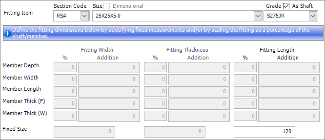 In the example below, the fitting item is a 25X25X5 equal angle. As this is a linear section, only the length of the fitting needs to be specified.