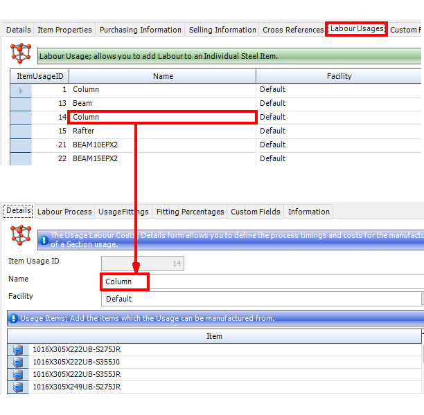 For example, you might have a labour usage called Column. It can be made from steel section W 10X100 A992 or W 10X112 A992. Its manufacture requires several processes, Cutting, Assembly, Handling and Inspection and it requires Fittings 2 x PB2 and 2 x PC1. You can specify all of this information in various tabs on the Labour Usage form.
