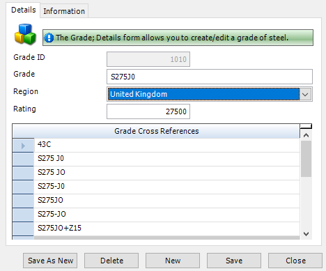 Use this form to administer the library of steel grades that can be assigned to Section Types. You can add Grades in the Setup Wizard, manually create Grades or import them using the Import/Export Wizard as an XML import.