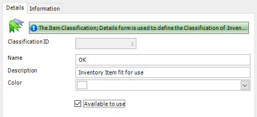 | Available to use | Select this check box to allow the use of inventory items with this classification. Deselect the check box to prevent the use of inventory items with this classification. Items that cannot be used are displayed in the Non Usable tab on the Inventory Search form. |