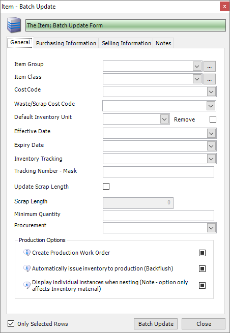 The following instructions tell you how to use the Item - Batch Update form to make changes to the properties of multiple items in the Item Library. You can Batch Update general information, purchasing information, selling information and notes.