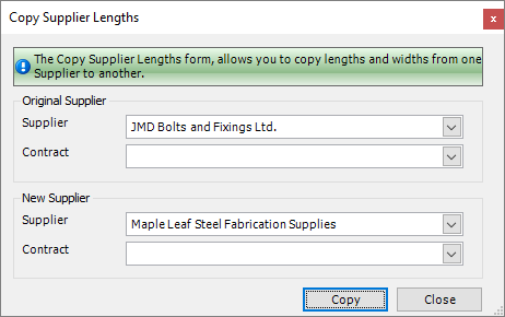 The following instructions tell you how to copy standard steel lengths from one Supplier to another for one or more selected items. The Supplier from whom you copy information must be listed on the Item - Purchasing Information form and must have Supplier Lengths set up (see Supplier Lengths). You can copy the steel lengths between suppliers on a per Contract basis if necessary however a Contract must be selected at the point of transfer for this to be effective.