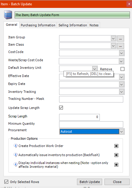 Select Only Selected Rows to update only the items that you highlighted. If you do not select this check box, all items will be updated. |