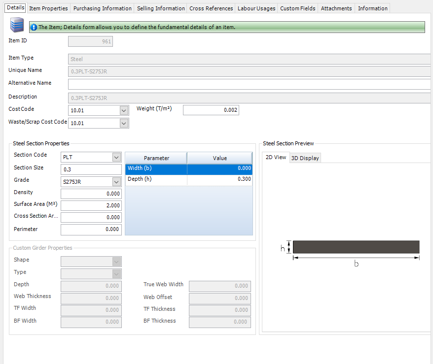 When you edit or add a new item, the Details tab is displayed. It shows basic information for the item. For steel items, this tab also includes all the physical properties, such as dimensions, weight per linear metre and surface area.