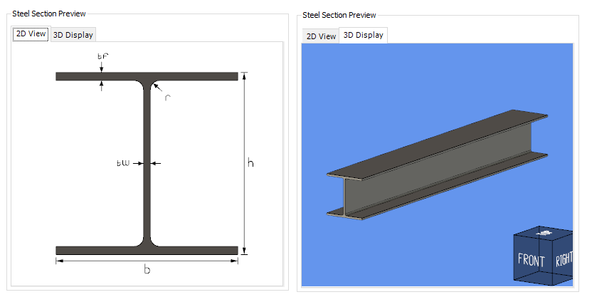 In the grid, enter values for the Width, Depth, Web Thickness, Flange Thickness and Root Radius of the steel section. These dimensions are displayed graphically in a 2D of 3D format in the Steel Section Preview and can be moved between using the available tabs. The 3D view can be rotated to look at different faces.