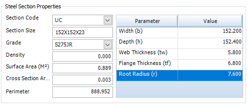 Specify the Section Code, Size and Grade and complete the other properties (Density, Surface Area, Cross Section Area, and Perimeter) to define the steel section.