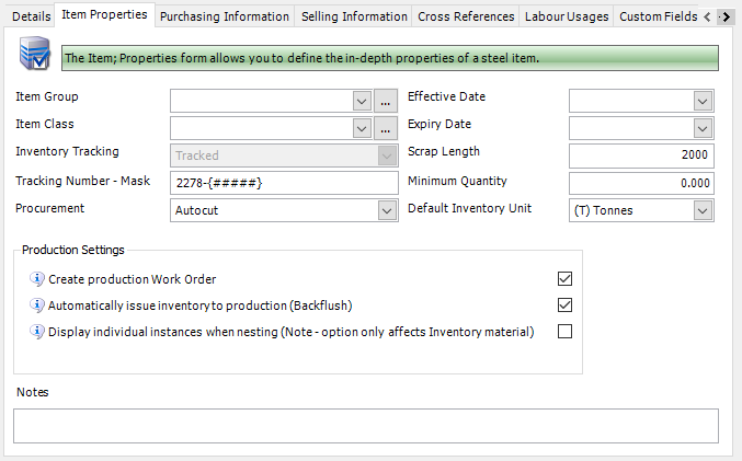Some of the fields on this tab affect the way in which the item is managed or displayed during nesting and ordering. For this reason, you should review them carefully.