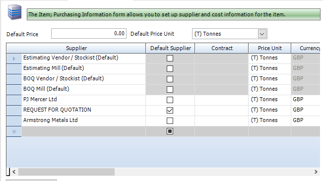 Where a price is not specified for a supplier, the Default Price and Price Unit are used. |