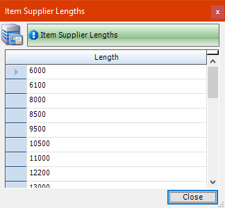 Click the Supplier Lengths button to enter a range of standard lengths that your supplier can provide. AutoCut only nests steel members against a supplier if they have standard lengths defined in the Item Library. These are not pre-defined by the Section Wizard, so it is important that you set them up here. |