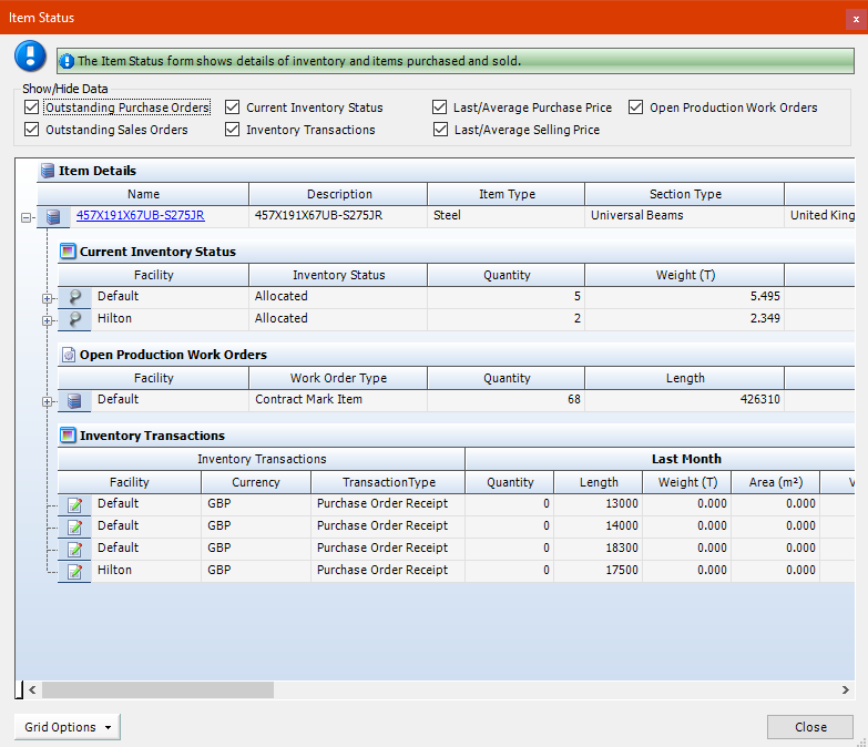 Use this form to take a look at the purchasing and sales details of selected items. You can also see how the selected items are managed in Inventory and Production.