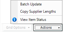 § On the search gird for the Item Library, the Actions button options are as follows: § You can amend multiple items. See Batch update item information. § You can copy steel lengths from one supplier to another. See Copy supplier lengths. § You can view the status of an item, including its purchasing and sales history and its management in production. See Item Status.