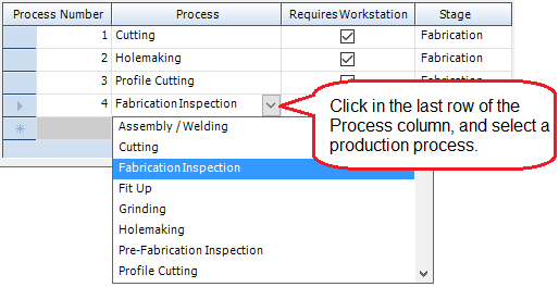 To add a process, either click or press the down-arrow in the Process column and select a process as shown below.