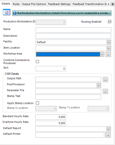 Use this form to specify basic information about a workstation, in particular the CAM details that are exchanged with the machine if it uses CNC.