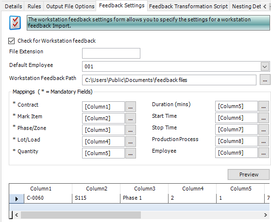 Use these fields to map STRUMIS terms/information to the terms/information used in the files produced by the CNC machine. The mapping process is similar to that of the CAD Interface. The test file is loaded into the system via the Preview button then when it has been loaded, select the correct fields to be mapped by examining the Preview. You can choose the correct columns to be placed into the Mappings by clicking on the Ellipsis button to the side of each heading and then selecting the desired column name.