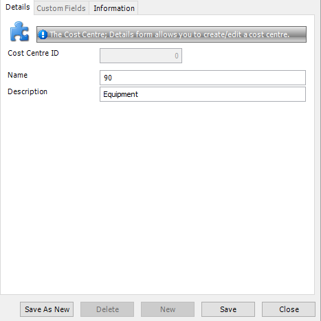 If you intend to add a lot of new Cost Centres, consider using the Save As New function to save the new records. This will keep the new Cost Centre form open after each save. Alternatively, if the number of records to be added is quite large, contact STRUMIS support to discuss the option of importing the new codes via a custom .XML file. |