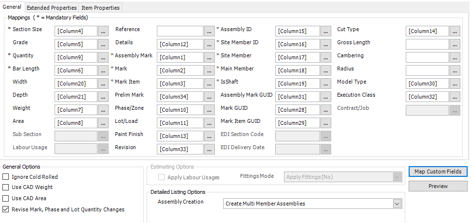 The Map Custom Fields button allows you to include additional data from either the modelling environment or the material list. This information is imported to the Mark Item Custom Fields tab within the Detailed Listing.