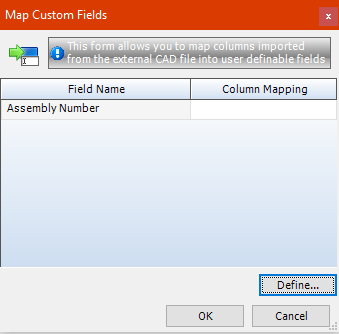 The mapping fields will be populated when you preview the Cad file. All columns headings found in the model will be mapped to the matching field and it is from here that you can rearrange these designations as needed. Once the Cad file has been loaded through the Preview function the el ipse buttons will be active. When you access this button on any field a new window will open and it is from here that fields can be mapped. If you do not wish to use this option, all fields are open to manual editing. |