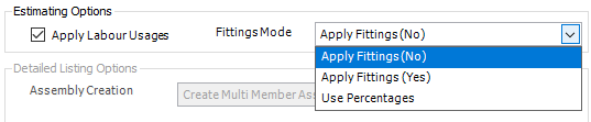 If the Cad Interface has been set as an Estimate type in the details tab, then the Estimate Options field will be activated in settings giving the option to automate some of the estimating functions. If Labour Usages were included in the model, then the box can be ticked. When this is active, the column that applies to the Labour Usage in the model will need to be identified within the labour Usage box in Mappings. If Fittings were included in the model and you wish to automatically include them in the Estimate, use the menu to identify this. The options list is related to the options available at the start of an Estimate in the Details field. You can choose to either apply fittings, ignore them or apply them as a percentage.