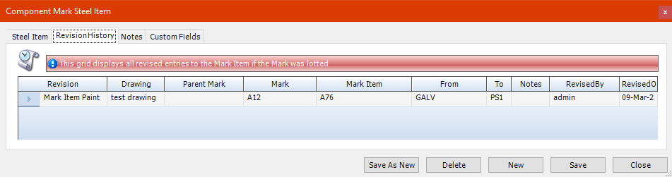 This tab shows details of any changes made to this mark or its mark items after it has been lotted.