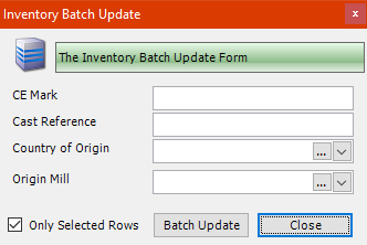 If you have multiple steel items that have a common CE mark, this batch update can be used to apply this to the chosen Inventory records. |