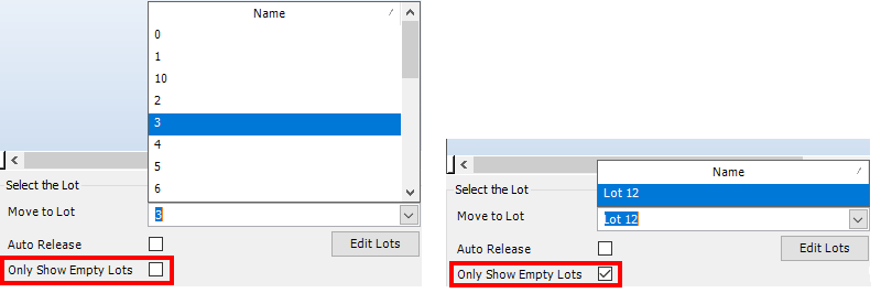 If you are assigning marks to a lot and would like to make sure that the chosen lot does not contain any other parts, select the option to Only Show Empty Lots. This will adjust the Move to Lot list to show only empty lots.
