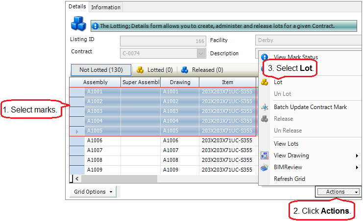 On the Production Lotting - Details form: § You can un-lot marks. To do this, select marks in the Lotted tab and click Actions (button) > Un Lot. § You can un-release marks. To do this, select marks in the Released tab and click Actions (button) > Un Release. On the Production Lotting - Move form: § You do not have to put the total quantity of each mark into the same lot. Use the Quantity To Lot column to specify the quantity of the mark to put into the lot. In the grid, you can view the quantity and weight of each item. This is useful information if you have to adhere to a maximum weight per lot. § You can specify an execution class for a mark using the Batch Update Mark function. See Batch Update Marks for more information. |