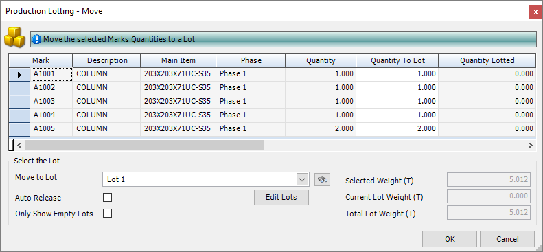 Auto Release, when selected, will automatically set the mark to the released status once the lot has been assigned. This will move it straight from the Lotted tab to the Released tab on the Production Lotting form where it will now be available for Nesting and Ordering.
