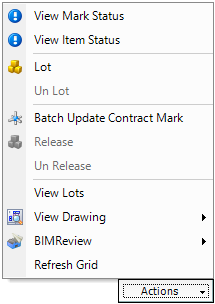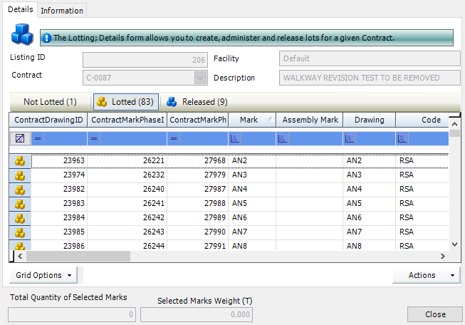 The grid shows the marks that are in the Detailed Listing for the connected Contract. Use the Actions button options to define lots, assign marks to lots and release marks for nesting and ordering.