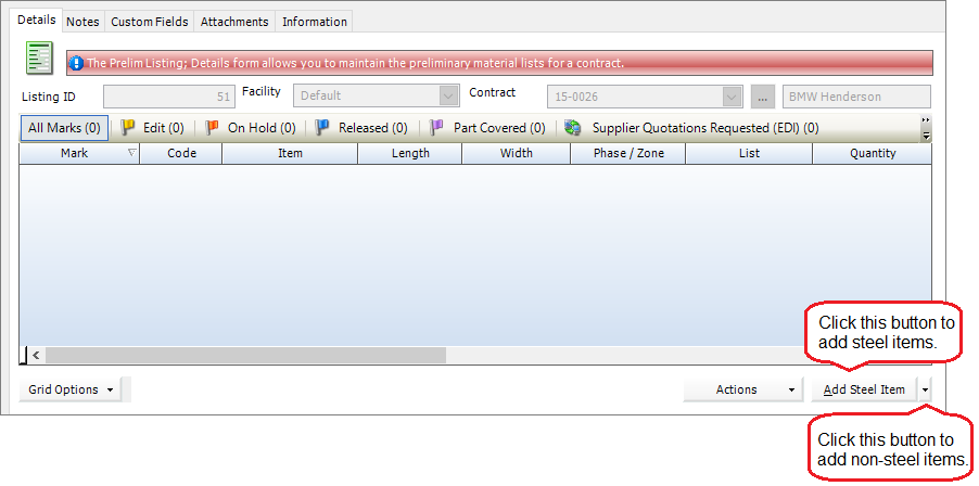 This topic tells you how to manually add steel and non-steel Prelim Marks to a Prelim Listing.