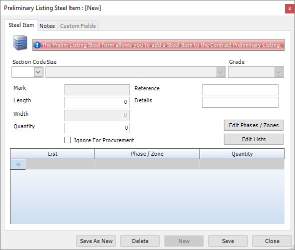 When you select the option to add a steel item, the Prelim Listing Steel Item form is displayed: