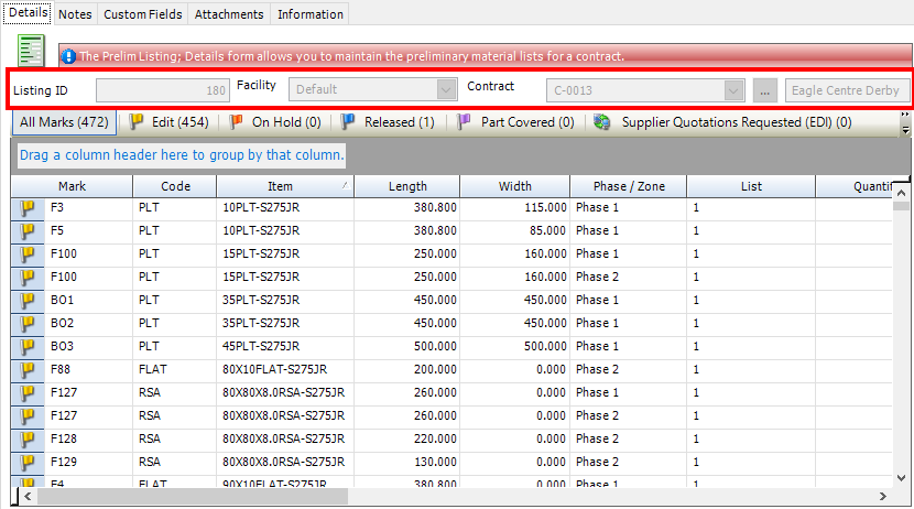 The grid has several smart filters, most of which list Prelim Marks with a particular status (the Supplier Quotations Requested smart filter and the Saved Nests smart filter are exceptions). In the grids that list Prelim Marks with a particular status, each row in the grid specifies the quantity of a particular Prelim Mark in a specific phase and list. Prelim Marks can be split across multiple phases and lists, which means that there may be more than one row for the same Prelim Mark. For example, a Contract may need two of Prelim Mark C3063 in phase 1 and three of Prelim Mark C3063 in phase 2, so Prelim Mark C3063 would appear within two instances inside the grid.