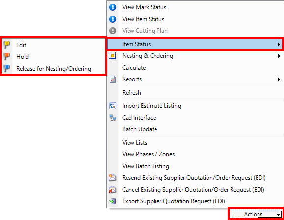 You can change the status of the item to Edit, Hold, or Release for Nesting/Ordering. See above for information about the item status. |