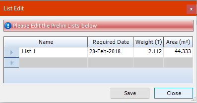 5. If you need to make a new list, use the Ellipsis button to create a new record. This will open the List Edit for where Lists within the Prelim can be maintained. This can also be accessed via the Actions button. As Prelim marks are assigned to lists in the Prelim the totals for weight and area will increase to reflect the sum of these Marks.
