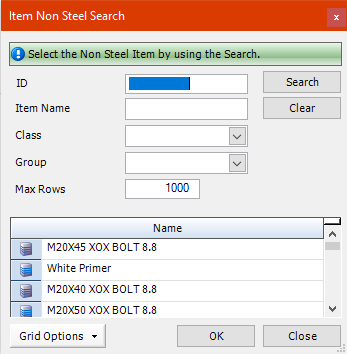 Non steel items to be imported may also not be recognised due to variations in the naming conventions. To reference and import a non steel item, use the item picker and select the non steel items tab. This will display a drop down menu that contains all non steel items in the library. Using the binoculars icon will open up a secondary search form.