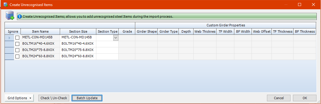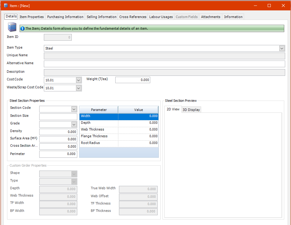 Enter the new item's section type and grade as it will appear in the Items Library. If the chosen section type does not have a grade available, then the grade field will not be active. For example, if the item to be imported is a cold rolled item then there will be no grade available. |