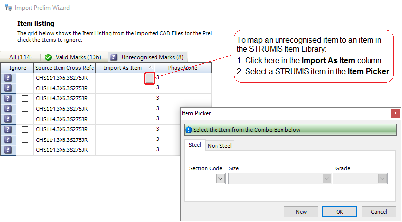 These are prelim marks in the import file that are not recognised by STRUMIS. This means that the system cannot match the item in the import file with an item in the STRUMIS Item Library. There are several ways to remedy this: