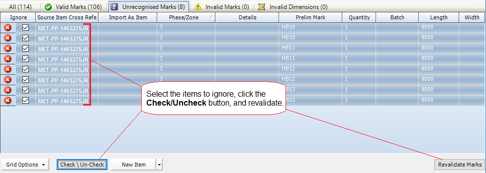 § If there are Prelim Marks that do not have an available cross reference, or you do not wish to use them in the Prelim Listing, you can choose to ignore the unrecognised Prelim Marks. This will mean that none of the items in the Unrecognised Marks tab will be imported into the listing. To do this, select the check box in the Ignore column. You can use the Check/Uncheck button to select or clear the check box in multiple highlighted rows as shown in the illustration below: