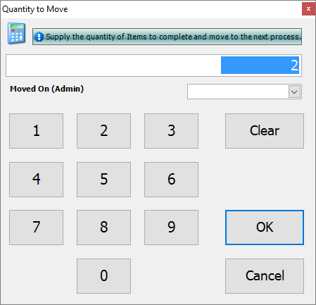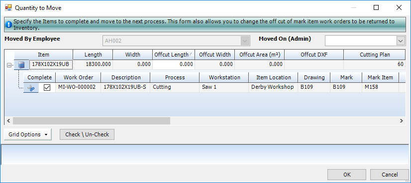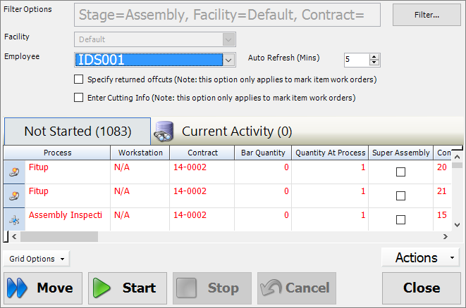 § Instead of using the Start and Stop buttons, you can click the Move button to move the item to the next process. No employee timesheet entry is created. § If you select multiple lines on which to work, and then click Start, the items that you selected are considered to be in a batch for the purposes of the production console. You must process the items in a batch together. The rules are: § The items