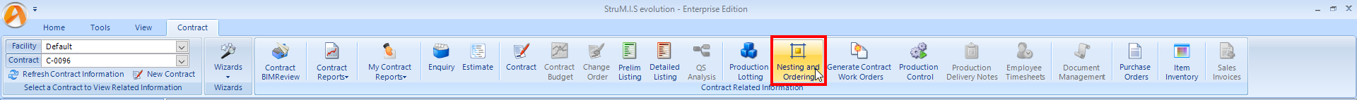 To access Production Nesting and Ordering, click the Nesting and Ordering button on the Contract Ribbon. Alternatively, from the sidebar menu, go to Production > Nesting & Ordering.
