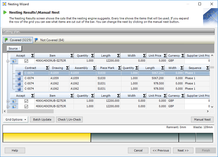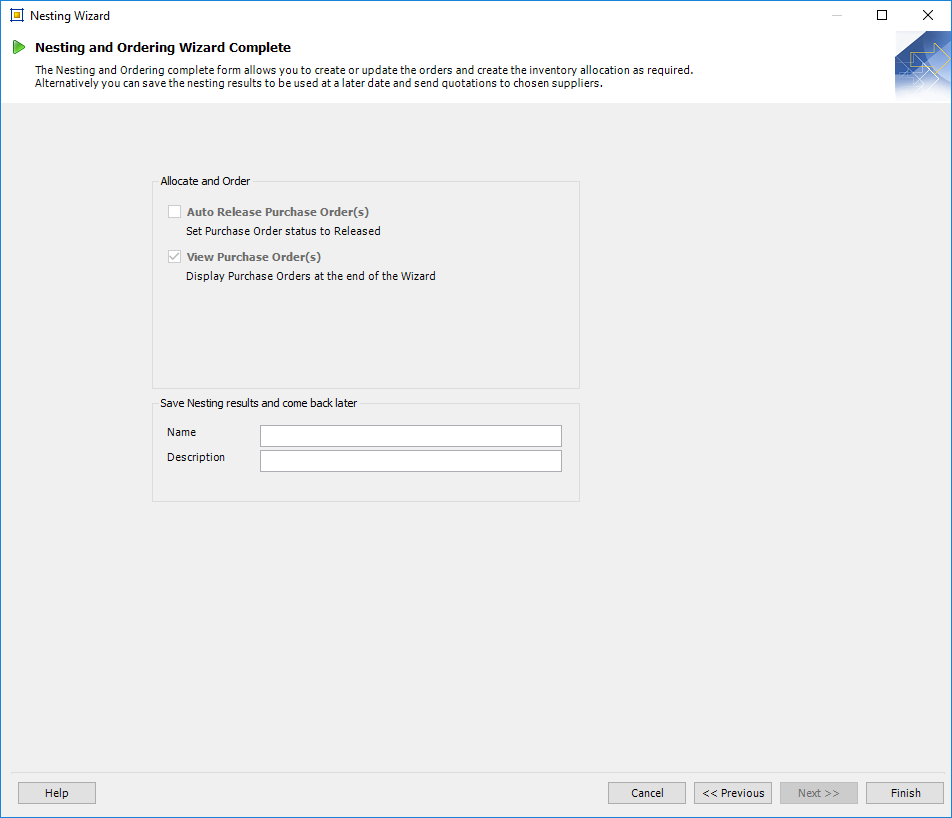 When you have selected/completed the relevant options, click Finish to create purchase orders and RFQs, and to save the nest.
