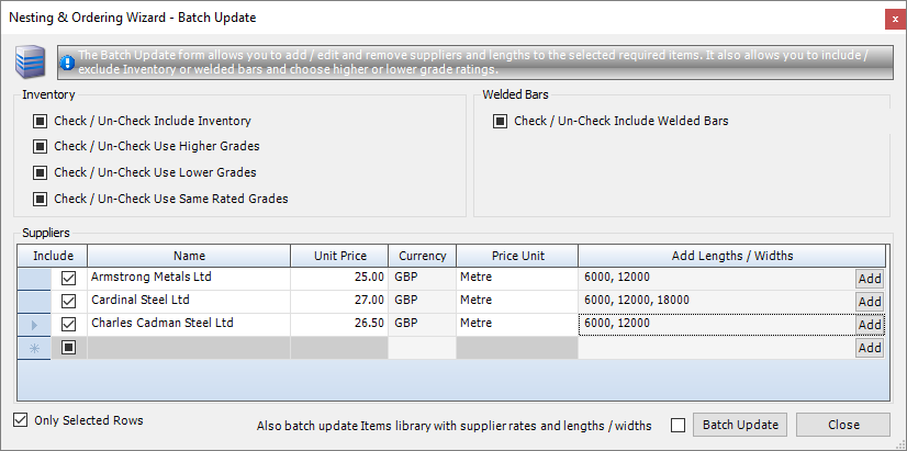 This Batch Update form applies to the Nesting Wizard, Select Suppliers and Inventory Lengths and Required Sections grid. It allows you to quickly add, remove or edit supplier lengths, include or exclude inventory or welded bars, and specify whether to nest to higher or lower grade inventory.
