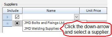 Use this grid to add new suppliers for the selected items and to amend details for suppliers that are already listed. To amend the details for any supplier, you must first add them to the list. To do this, select the supplier from the drop-down list in the Name column as shown below: