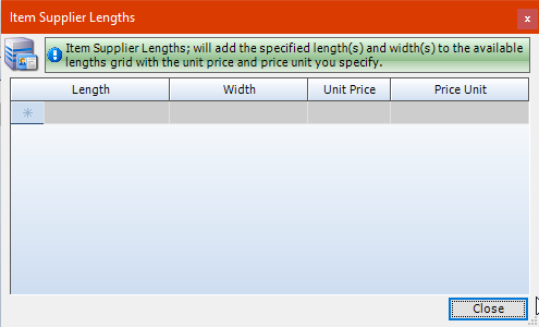 § Add supplier lengths. To do this, click the Add button in the Add Length/Widths column. The Add Supplier Lengths form is displayed. Type in the required lengths and click Close. The lengths are displayed in the Add Length/Widths column.