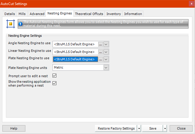 Use this form to specify the nesting engines to use for bars, angles and plate.