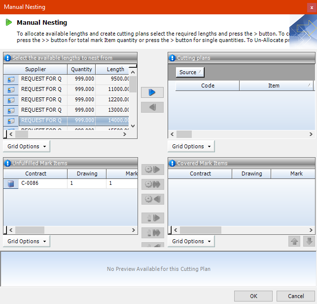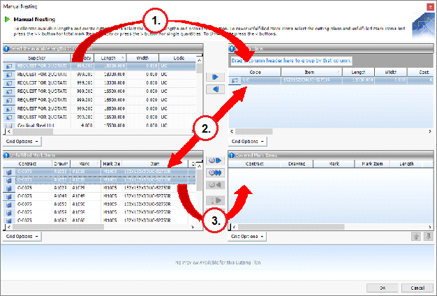 Use the Manual Nesting form to manually allocate prelim marks (prelim nesting only) or mark items (production nesting only) to available lengths of steel. You can access the Manual Nesting form from the Nesting Results/Manual Nest screen of the Nesting Wizard which will be available if you select Manual Nesting from the Actions Button.